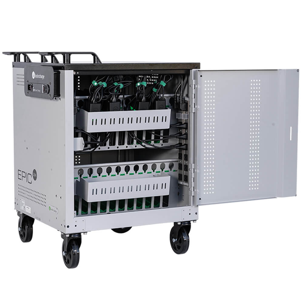 The LocknCharge EPIC 24 Prewired 65W Charging and Storage Cart is a versatile, high-capacity solution for storing, charging, and securing up to 24 devices in classrooms, labs, and shared workspaces. Designed for efficiency and convenience, it comes with pre-installed USB-C 65W Power Delivery cables in each slot, providing fast, reliable charging for laptops, tablets, Chromebooks, and other USB-C devices. Its mobile design, durable construction, and integrated cable management make it easy to transport devices safely while keeping them organized and ready for use. The EPIC 24 cart ensures devices are secure, fully charged, and accessible whenever needed.