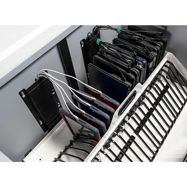 The LockNCharge Joey 30 MK4 Prewired USB-C 45W Charging Cart with Baskets is a compact, mobile charging solution designed to store, charge, and secure up to 30 USB-C devices efficiently. Perfect for classrooms, labs, and shared workspaces, it comes with pre-installed USB-C 45W Power Delivery cables in each slot, allowing fast deployment with no setup hassle. Its innovative basket system simplifies device deployment and retrieval, while the mobile cart design allows you to move devices between rooms or workspaces easily. Durable construction, integrated cable management, and a secure locking mechanism ensure devices are organized, protected, and ready for use whenever needed.