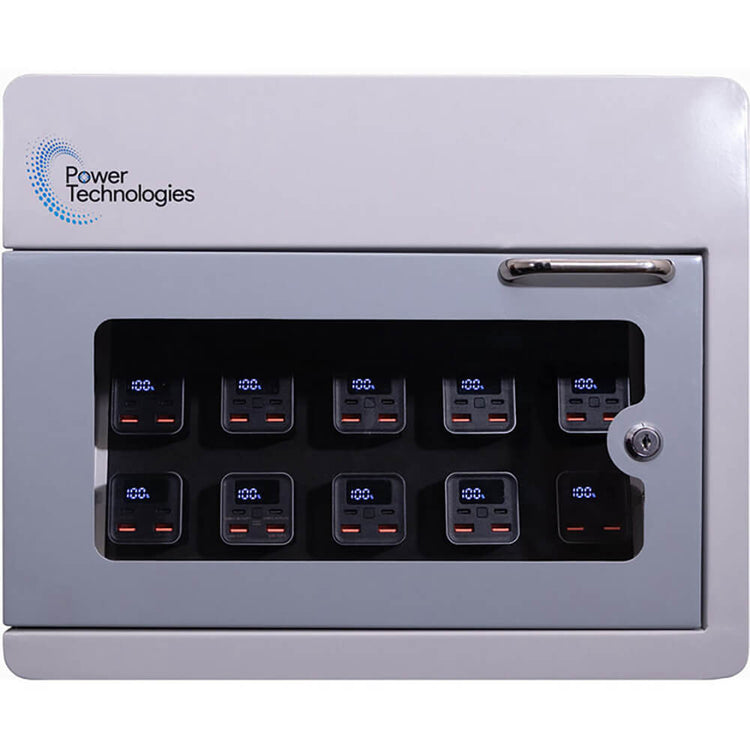 Power Technologies PowerVault 10 Bay Secure Charging Cabinet (CAB-PVS-B10K-D10) is a compact, lockable charging solution designed to store, charge, and secure up to 10 PowerBank™ 20,000mAh Li-ion batteries—so students, staff, and guests can quickly recharge phones, tablets, and other USB devices wherever they are. This PowerVault-10/10 kit includes the cabinet plus 10 PowerBank batteries (110V North America model). (Power Technologies)